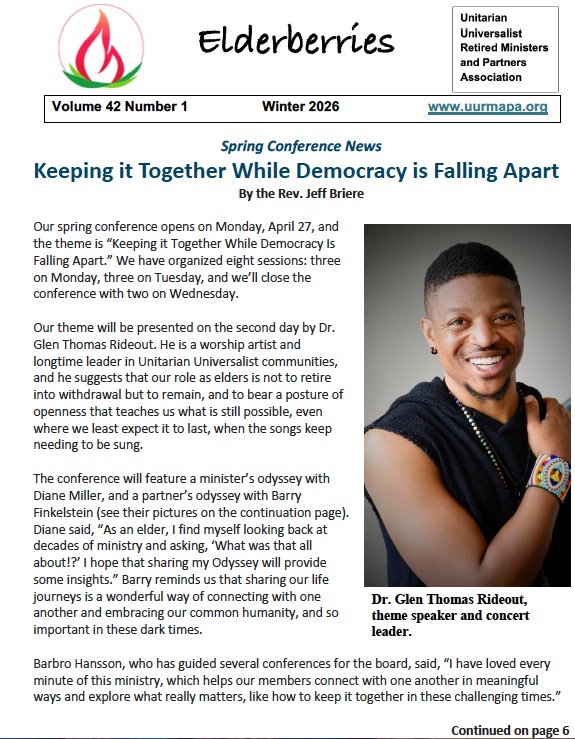 The UURMaPA newsletter, Elderberries, is mailed to members four times a year, full of news and information (especially the online full-color edition, available here, which may be longer than the condensed, mailed version). The current and archived issues are posted online (here and below).